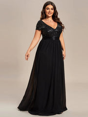 Plus Size V-Neck Cap Sleeve Sequins Chiffon Maxi Evening Dress - Black