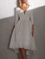 Reception Fall Wedding Dresses Little White Dresses A-Line V Neck 3/4 Length Sleeve Asymmetrical Lace Bridal Gowns With Appliques Solid Color Summer Wedding Party , Women's Clothing