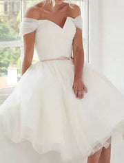 Reception Little White Dresses Wedding Dresses A-Line Off Shoulder Cap Sleeve Knee Length Lace Bridal Gowns With Sash / Ribbon Solid Color - US 2 / UK 6 / EU 32
