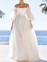 Reception Wedding Dresses A-Line Off Shoulder Half Sleeve Sweep / Brush Train Satin Bridal Gowns With Flower