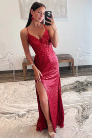 Red Sequin Plunge V Backless Mermaid Prom Dress with Slit