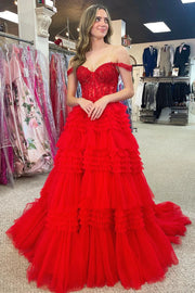 Red Tulle Off-the-Shoulder Ruffle Tiered Long Prom Dress