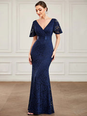 Ribbon Waist V-Neck Short Sleeve Lace Bodycon Fishtail Evening Dress