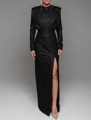 Sheath Black Dress Evening Gown Glittering Dress Formal Masquerade Floor Length Long Sleeve Jewel Neck Lurex Fabric with Slit