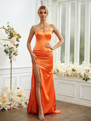 Sheath/Column Elastic Woven Satin Ruched One-Shoulder Sleeveless Sweep/Brush Train Bridesmaid Dresses