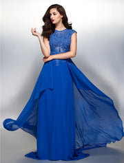 Sheath / Column Elegant Floral Formal Evening Wedding Party Dress Illusion Neck Short Sleeve Sweep / Brush Train Chiffon with Appliques