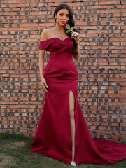 Sheath/Column Satin Ruched Off-the-Shoulder Sleeveless Sweep/Brush Train Dresses