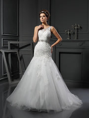 Sheath/Column Scoop Applique Sleeveless Long Net Wedding Dresses