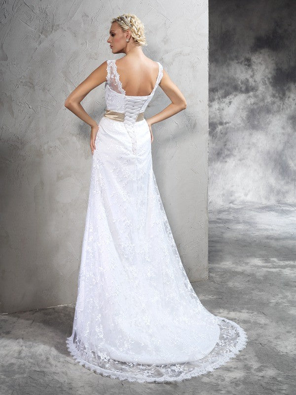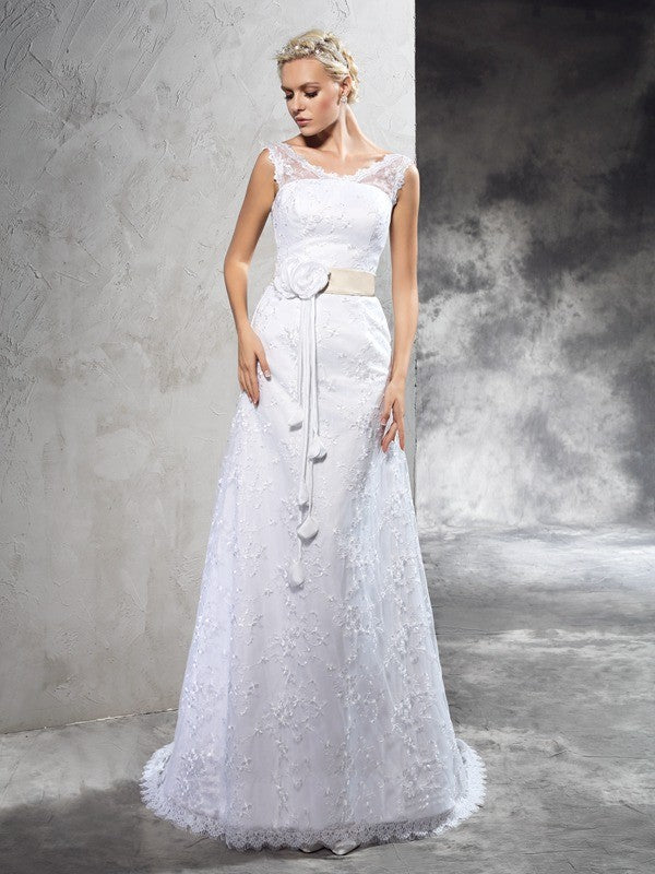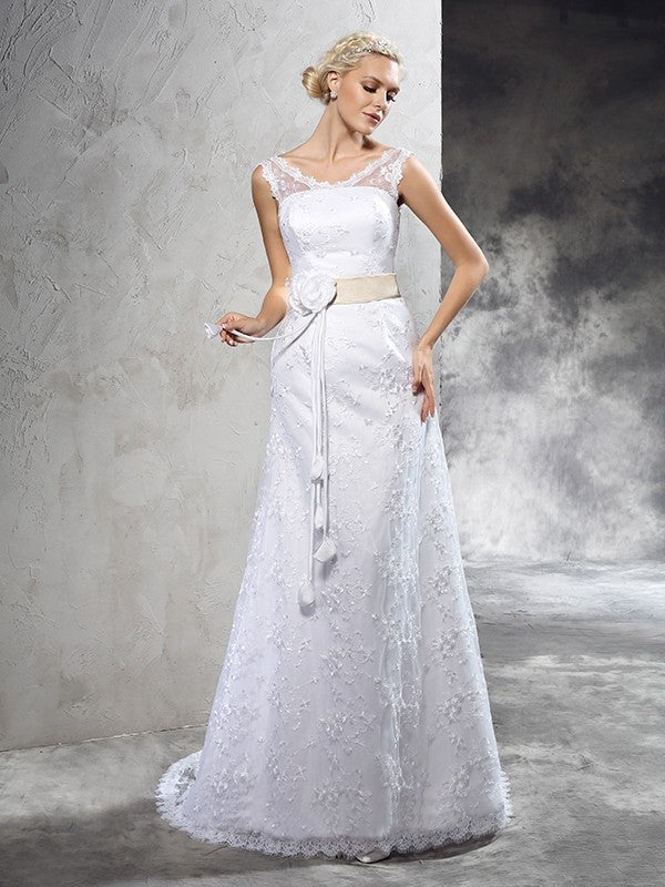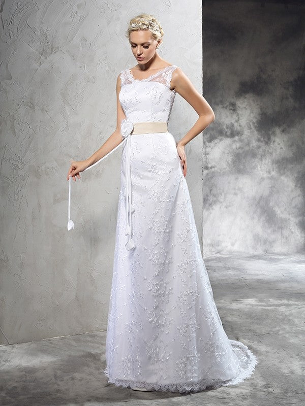 Sheath/Column Sheer Neck Hand-Made Flower Sleeveless Long Satin Wedding Dresses