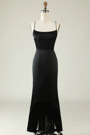 Spaghetti Straps Black Satin Prom Dress with Fringes