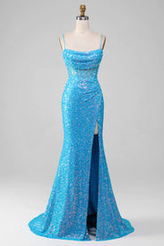 Spaghetti Straps Blue Sparkly Corset Prom Dress with Slit