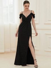 Spaghetti Straps Cold Shoulder Maxi Wedding Guest Dress