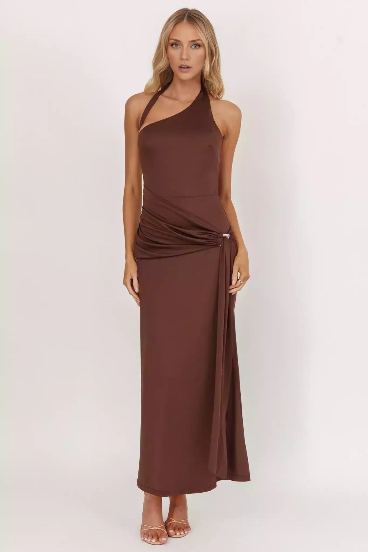 Stunning mid length lining with asymmetrical neckline, waist tie, back with zipper Prom Dresses