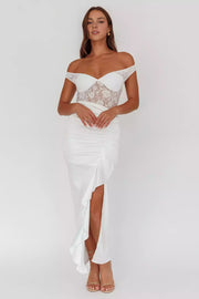 Stunning satin lace corset with lining, thigh splits, ruffled edges, back zipper Prom Dresses