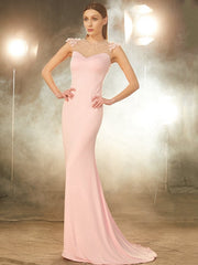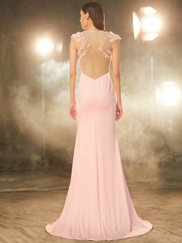 Trumpet/Mermaid Jewel Short Sleeves Sweep/Brush Train Beading Spandex Dresses