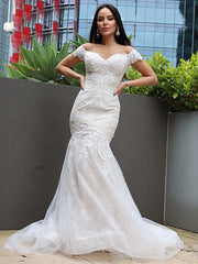 Trumpet/Mermaid Tulle Applique Off-the-Shoulder Sleeveless Sweep/Brush Train Wedding Dresses - US 2 / UK 6 / EU 32