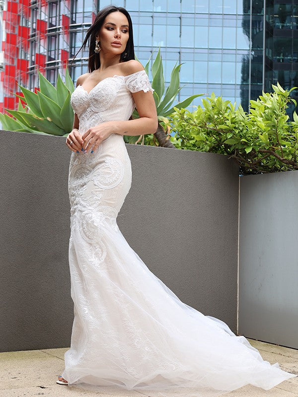 Trumpet/Mermaid Tulle Applique Off-the-Shoulder Sleeveless Sweep/Brush Train Wedding Dresses