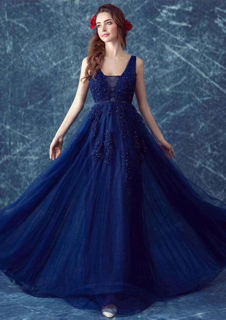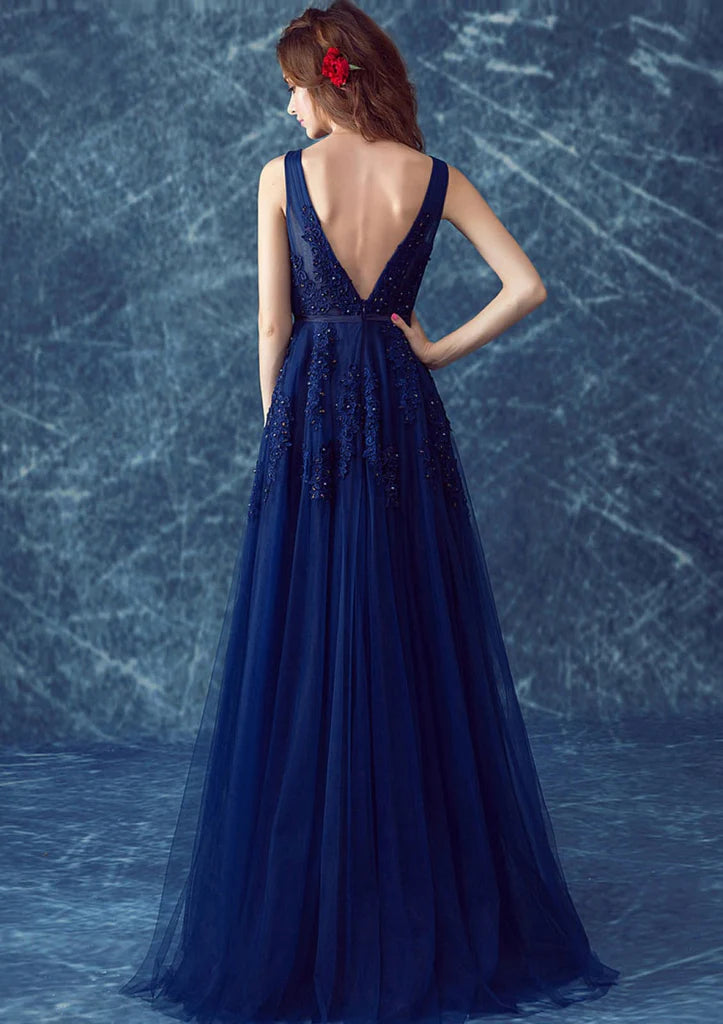 Tulle Sweep A-Line Sleeveless V-Neck Evening Prom Dress, Lace Beaded - DARK NAVY