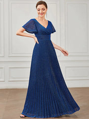 V-Neck Short Sleeve Pleated A-Line Evening Dress