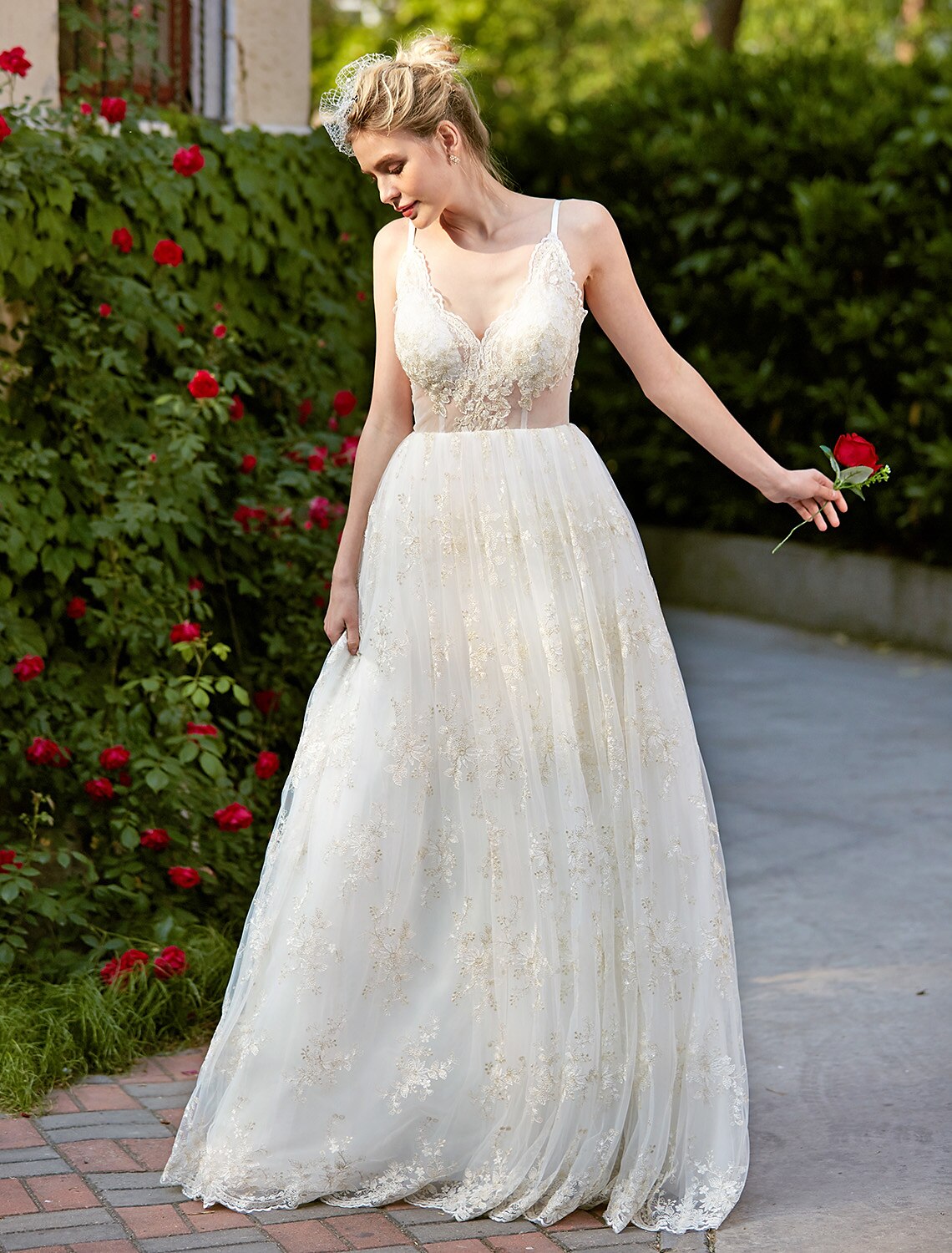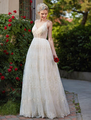 Wedding Dresses A-Line V Neck Sleeveless Floor Length Lace Bridal Gowns With Appliques