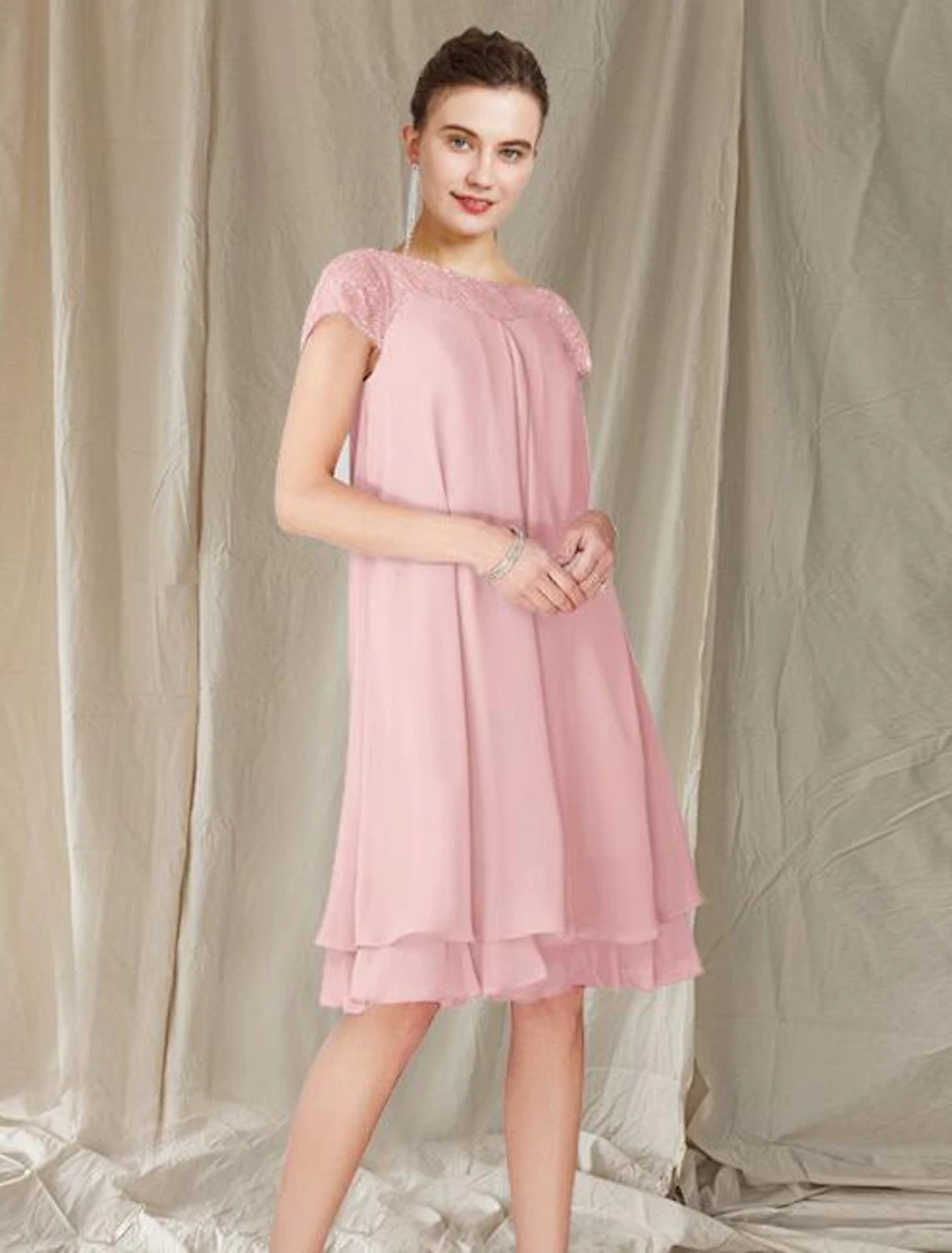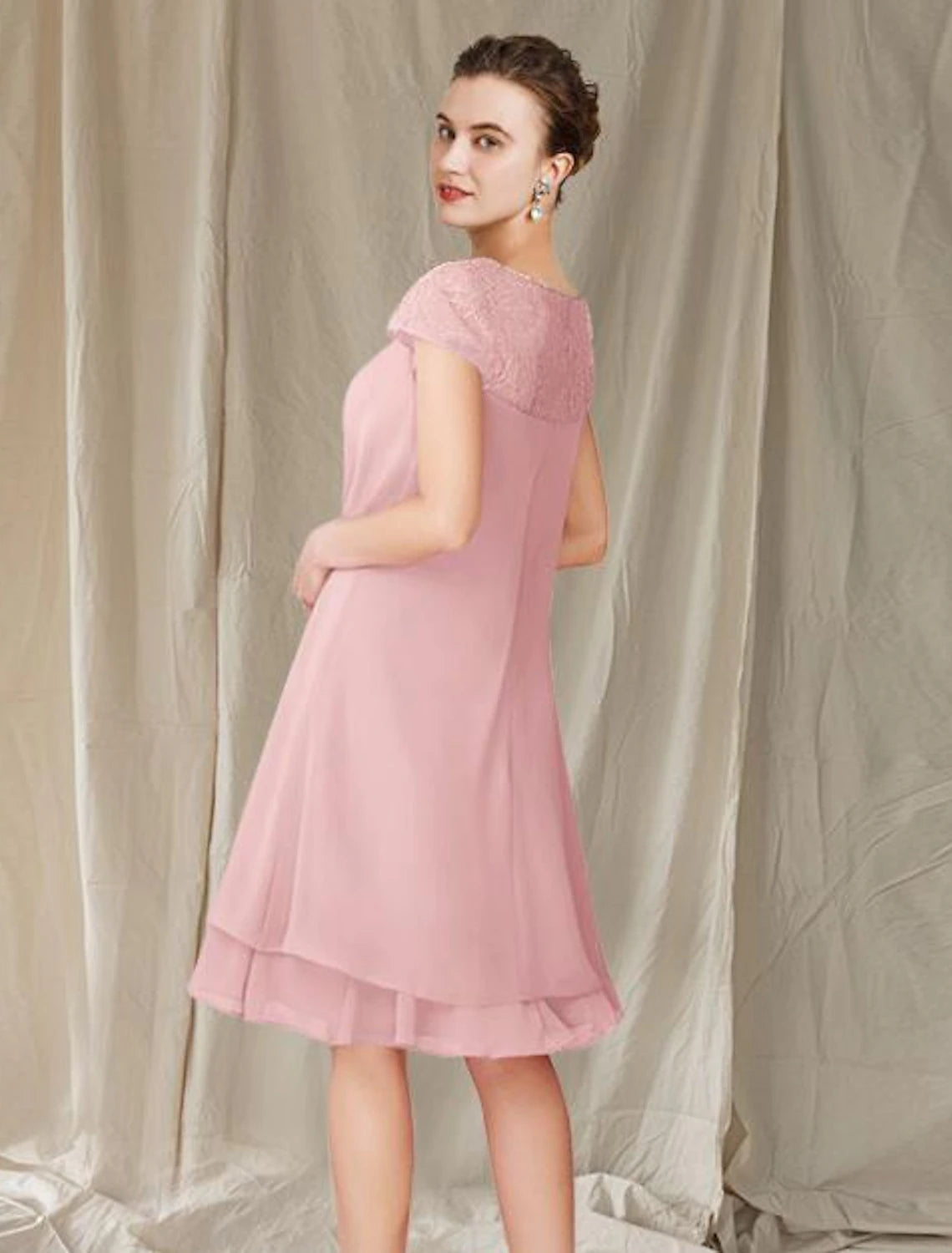 A-Line Mother of the Bride Dress Elegant Jewel Neck Knee Length Chiffon Lace Short Sleeve with Pleats