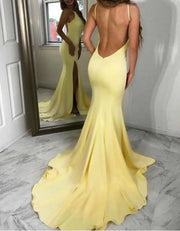 Yellow Mermaid Backless Spaghetti Straps Prom Dresses With Side Split