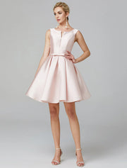 DingjiA-Line Cute Dress Wedding Guest Homecoming Knee Length Sleeveless V Wire Satin with Bow(s) Pleats - Pink / US 2 / UK 6 / EU 32