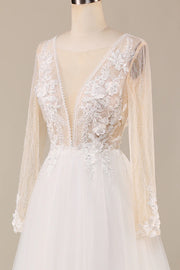 A Line Deep V-Neck Ivory Tulle Sweep Train Wedding Dress with Lace