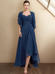 A-Line Mother of the Bride Dress Elegant High Low Square Neck Asymmetrical Tea Length Chiffon Lace Cap Sleeve Wrap Included with Sequin Appliques Side-Draped