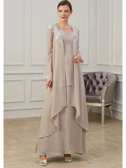 A-Line Mother of the Bride Dress Elegant Jewel Neck Floor Length Polyester Long Sleeve with Appliques - US 2 / UK 6 / EU 32