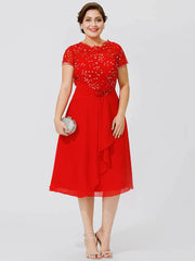 A-Line Mother of the Bride Dress Elegant & Luxurious Beautiful Back Plus Size Jewel Neck Knee Length Chiffon Beaded Lace Short Sleeve No with Pleats Beading Flower
