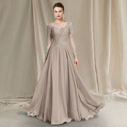 A-Line Mother of the Bride Dress Luxurious Elegant Jewel Neck Floor Length Chiffon Lace Long Sleeve with Pleats Appliques