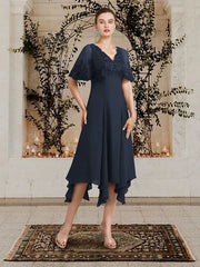 A-Line Mother of the Bride Dress Plus Size Elegant High Low V Neck Asymmetrical Tea Length Chiffon Lace Sleeveless with Appliques - US 2 / UK 6 / EU 32