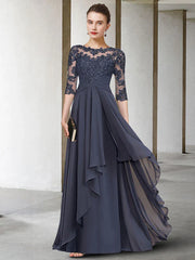 A-Line Mother of the Bride Dress Plus Size Elegant Jewel Neck Floor Length Chiffon Lace 3/4 Length Sleeve with Pleats Ruched Appliques