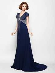 A-Line Mother of the Bride Dress V Neck Court Train Georgette Short Sleeve with Beading Sequin