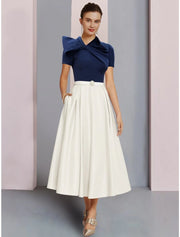 A-Line Mother of the Bride Dress Wedding Guest Elegant Jewel Neck Tea Length Satin Short Sleeve with Bow(s) Crystal Brooch Ruching - Dark Navy / US 2 / UK 6 / EU 32
