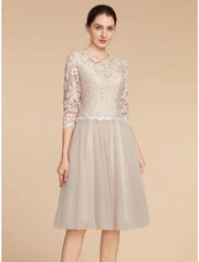 A-Line Mother of the Bride Dress Wedding Guest Elegant Petite Jewel Neck Knee Length Lace Tulle Half Sleeve with Pleats Solid Color