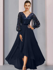 A-Line Mother of the Bride Dress Wedding Guest Sparkle & Shine High Low Jewel Neck Asymmetrical Tea Length Chiffon Lace Sequined Long Sleeve with Sequin Appliques Fall