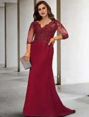 A-Line Mother of the Bride Dresses Plus Size Hide Belly Curve Elegant Dress Formal Court Train 3/4 Length Sleeve V Neck Chiffon with Sequin Slit Appliques