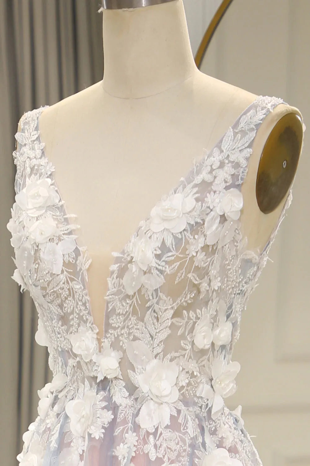 A-Line V-Neck Keyhole Back Long Tulle Prom Dress with Appliques