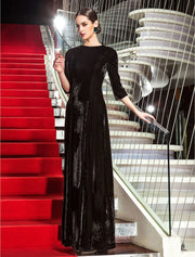 DingjiA-Line Celebrity Style Dress Wedding Guest Floor Length 3/4 Length Sleeve Jewel Neck Velvet with Pleats - Black / US 2 / UK 6 / EU 32