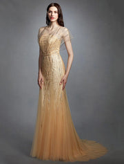 DingjiSheath / Column V Neck Sweep / Brush Train Tulle Made-To-Measure Wedding Dresses with Sequin
