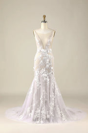 Ivory Mermaid Illusion Boat Neck Lace Wedding Dress