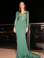 Jersey Long Sleeves V-neck Applique Prom Dresses