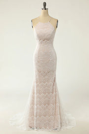 Mermaid Halter White Lace Wedding Dress with Sweep Train