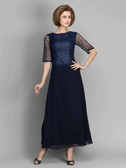 Mother of the Bride Dress See Through Jewel Neck Ankle Length Chiffon Half Sleeve with Lace Pleats