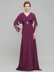 Mother of the Bride Dress V Neck Floor Length Chiffon 3/4 Length Sleeve with Criss Cross Crystals