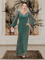 Sheath / Column Mother of the Bride Dress Elegant Sparkle & Shine V Neck Floor Length Lace Sequined Long Sleeve with Beading Sequin - US 2 / UK 6 / EU 32