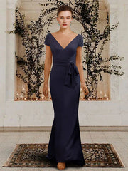 Sheath / Column Mother of the Bride Dress Elegant V Neck Floor Length Chiffon Short Sleeve with Bow(s) Appliques - US 2 / UK 6 / EU 32