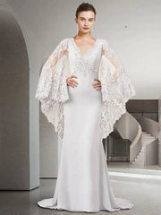 Sheath / Column Mother of the Bride Dress Luxurious Elegant V Neck Sweep / Brush Train Chiffon Lace Long Sleeve with Beading Appliques - US 2 / UK 6 / EU 32